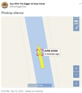As well as sparking worldwide attention and disrupting supply chains, it was the ship that launched a thousand memes. There were some entertaining twitter accounts including @Guywiththediggeratsuezcanal and @Boss_Suezdigguy. Plus there was a collective holding of breath as the ship made another (successful!) trip through the Canal in December.